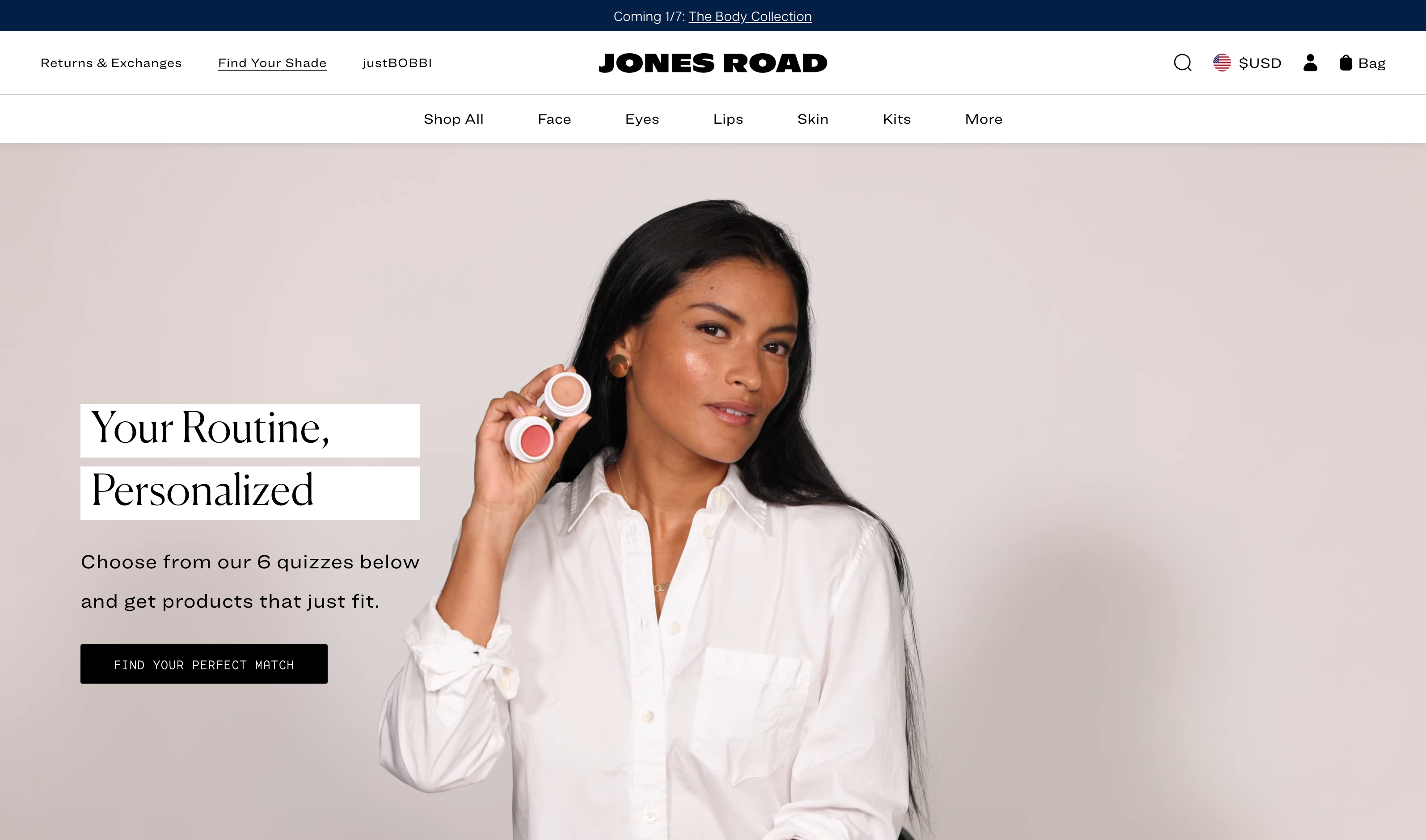Instead of a generic product page, Jones Road sends paid traffic directly to their quiz landing page. The page features a clear value proposition and invites customers to find their personalized routine.