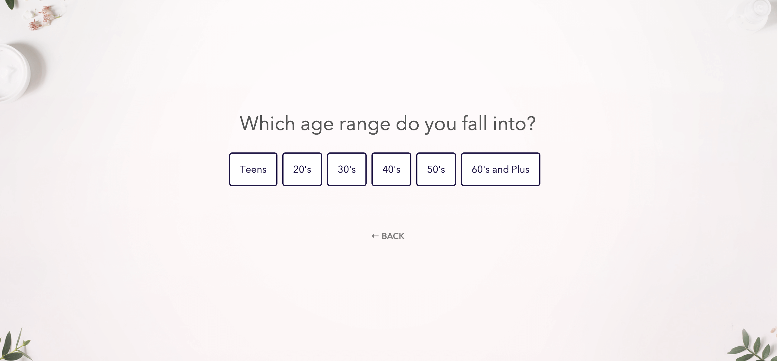 General questions about habits, climate, diet, and other factors that influence skin. These questions help customers feel they're getting a personalized experience. An example question is "What does an average day look like for you?"