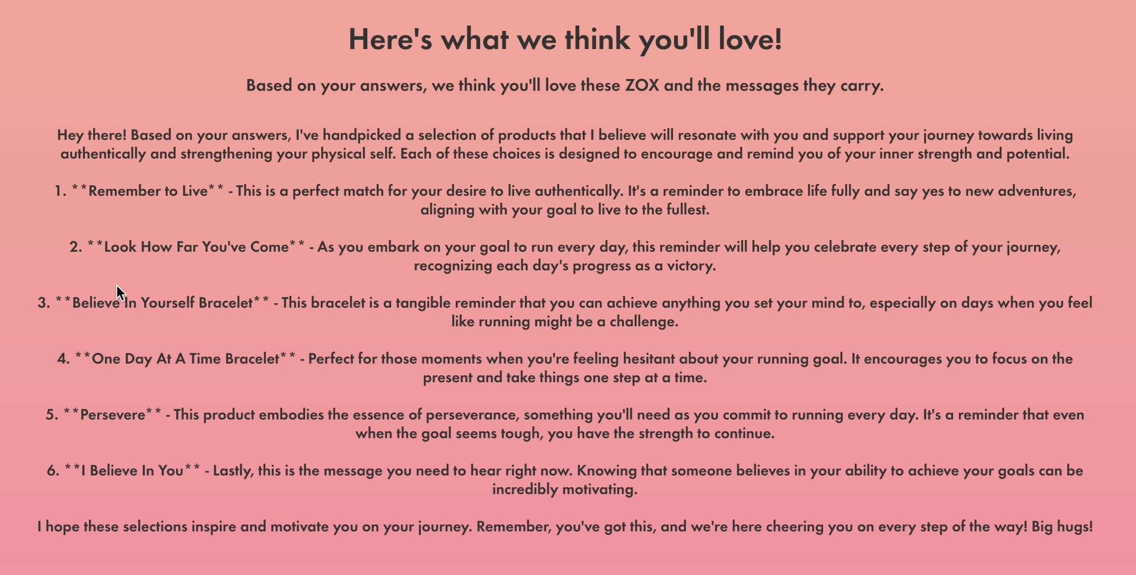 AI then looks at the shopper's answers, looks at all of the products on Zox, and then crafts a hand written note that recommends products that have affirmations that best resonate with this specific shopper.